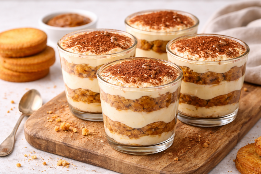 - Monter les verrines : biscuits, crème, biscuits, crème.
